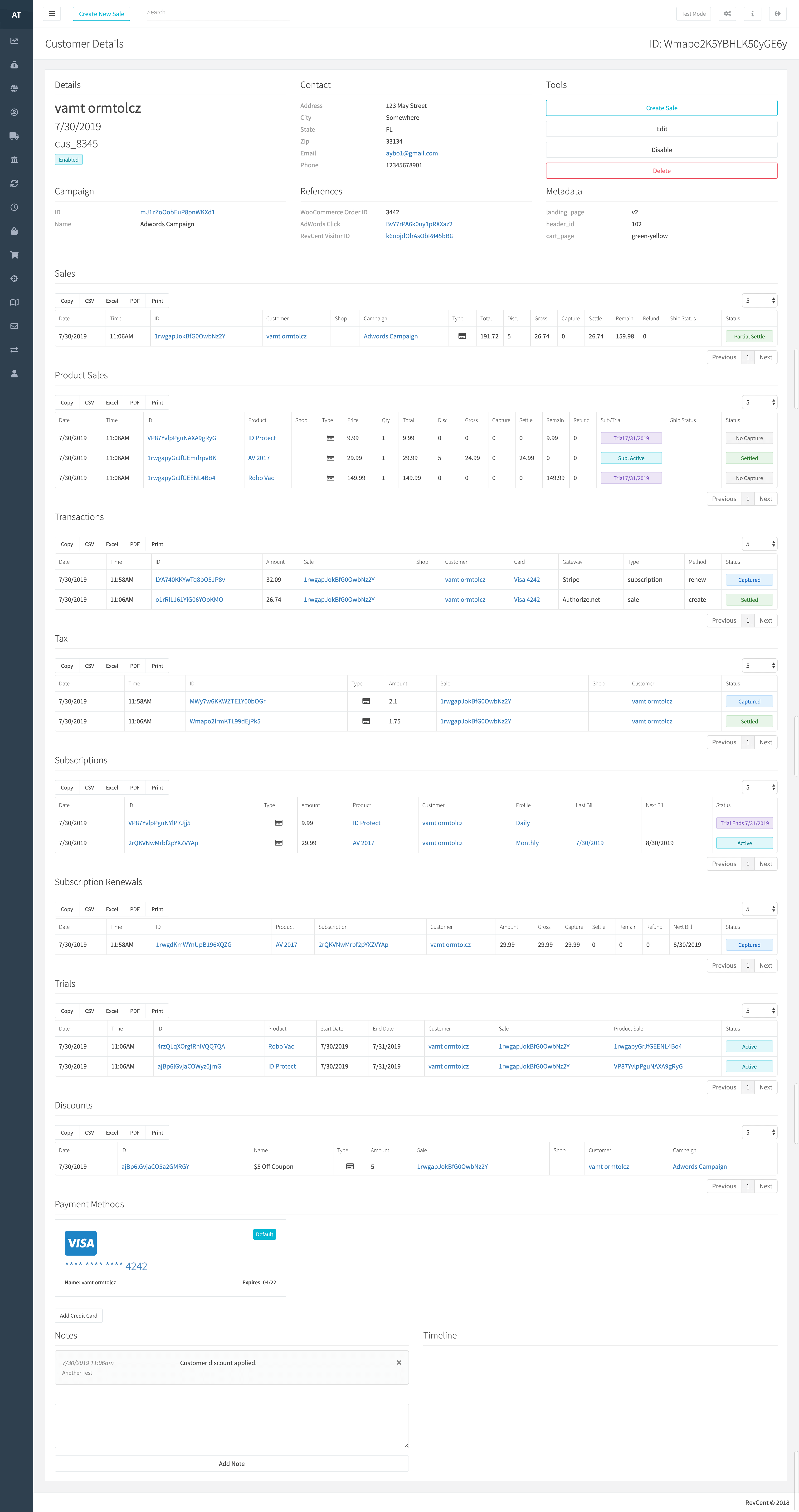 Open a customer's page to alter their contact info, or to instantly see all their previous sales, internal notes, shipments, and returns/refunds. You can edit their payment methods, or add new ones for future sales.