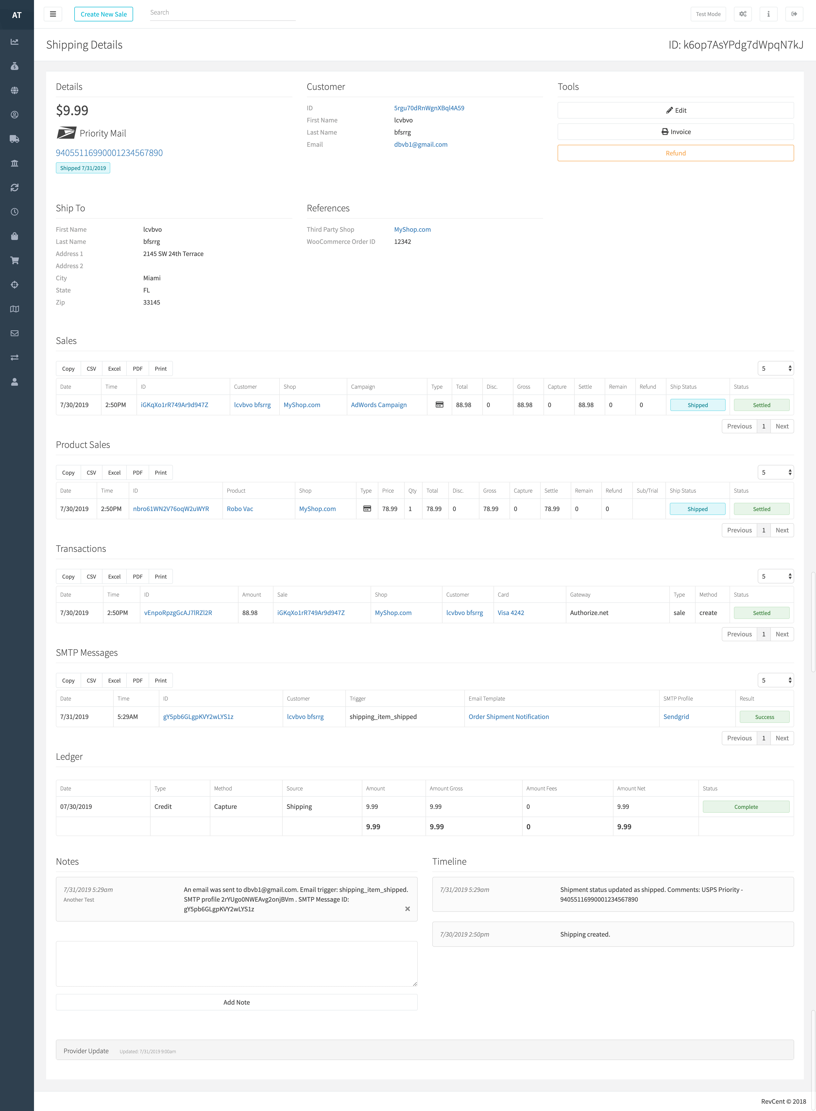 View all information related to an individual shipment, including shipping info and tracking data. Make modifications and see all related entities including sales and products sold.